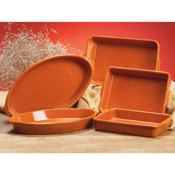 Fabricadas con arcillas rojas refractarias. Esmalte sin plomo. Aptas para: Gas, electricidad, vitrocerámica, hornos microondas y lavavajillas. Asadores rectangulares y ovalados preparados para hornos convencionales y microondas.